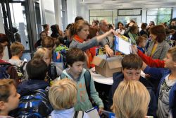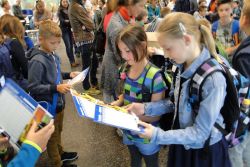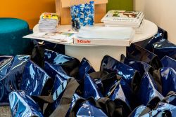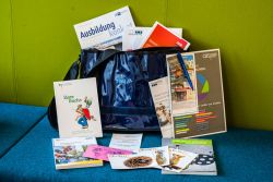 In diesem Jahr ist es eine praktische, marineblaue Planentasche mit 56 Broschüren und Flyern, die den Schülern einen Überblick über ihre Möglichkeiten nach dem Abitur geben und hilfreiche Informationen zur Berufs- und Studienwahl bereitstellen.